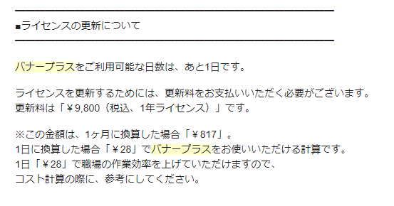 「バナープラス」は買い切り型ではなく、年間9,800円の更新料がかかります。