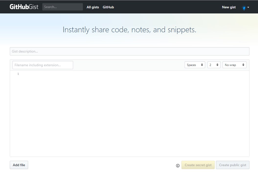 Githubはプログラムのリビジョンを管理するサービスです。このページで紹介する「Gist」という機能は、Githubのサービスの一部になります。ホームページ上にソースコードを埋め込むことだけを目的とした場合、Gist以外の機能を利用する必要はありません。2.New Gistを選択する