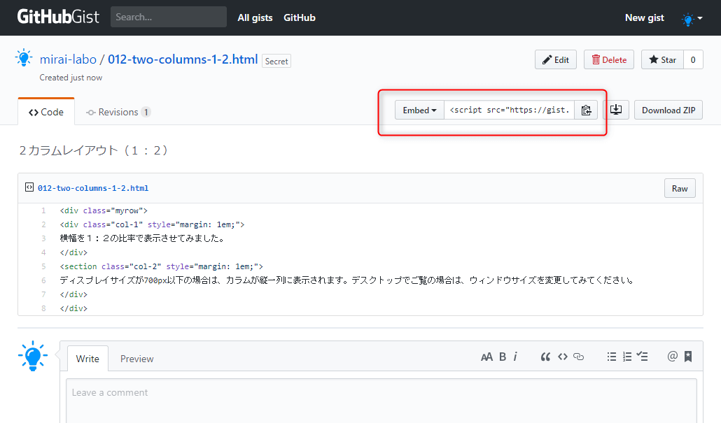 Gistにコードを登録すると、以下のようにホームページ埋め込み用のスクリプトコードが生成されます。
