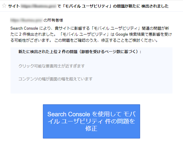 Googleさんから上記画像のような連絡が届きましたら、検索順位に影響しないよう、なるべく早めに解決されることをお勧めします。