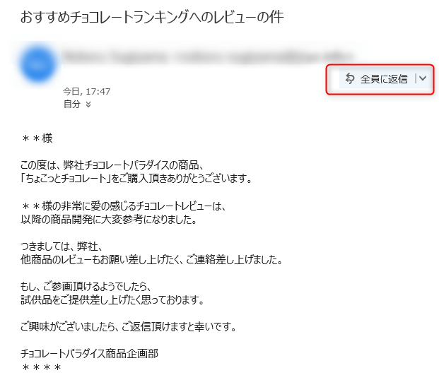 以下の画像の通り、「全員へ返信」をして、返信メールを作成します。