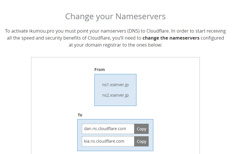 引き続き、画面の指示に従って、現在使っているネームサーバーを、Cloudflareのものに変更します。画面に表示された新しいネームサーバーをコピーしておいてください。