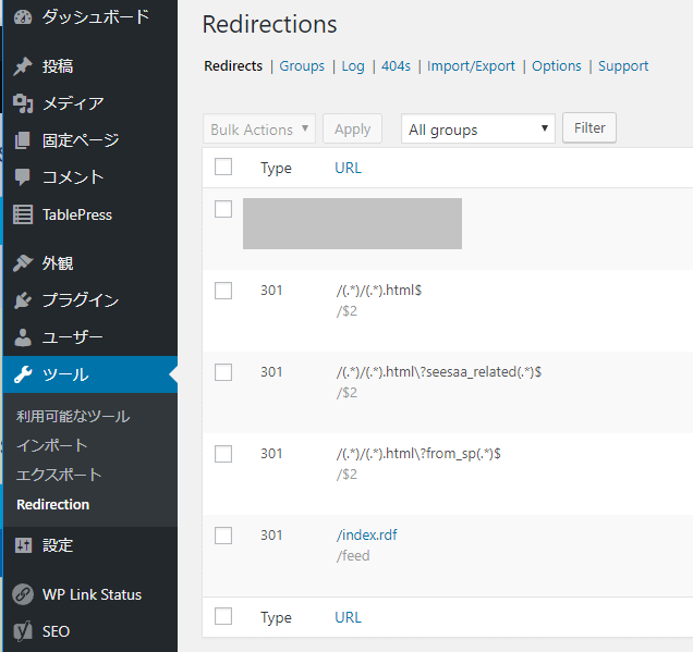 その他の設定は、WordPressのプラグイン「Redirection」に記載します。設定は以下の通りです。