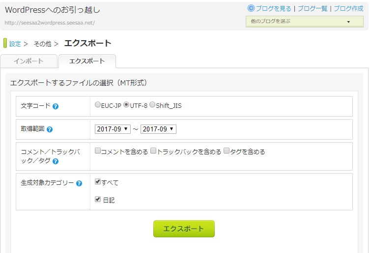 Seesaaのエクスポート機能から記事を出力します。「設定> その他> エクスポート」