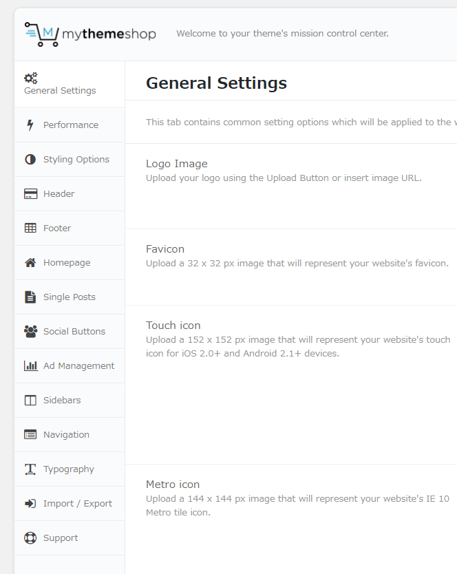 Socially Viral Proをはじめとするmythemeshopのテーマは、以下のような設定メニューがあります。