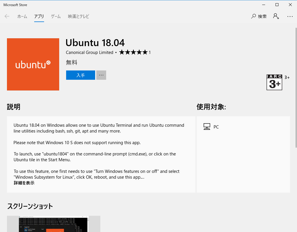 次に、以下のリンクから、Microsoft App版のUbuntuをインストールします。